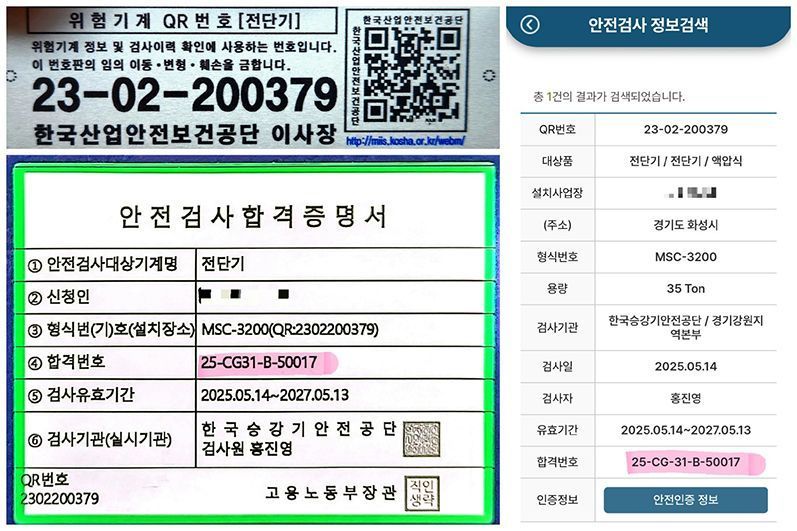 - 전단기(=샤링기) 안전검사, 인증완료(합격번호 25-BI-31-B-50017)