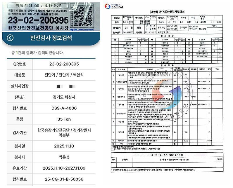 - 전단기(=샤링기) 안전검사, 인증완료(합격번호 25-CG-31-B-50056)